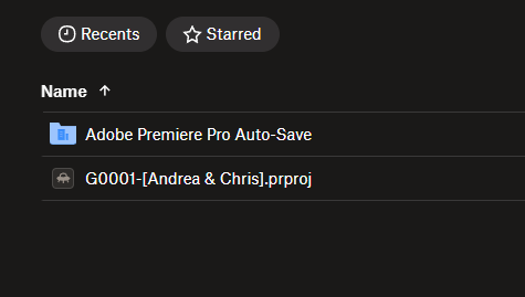 Let’s take the example of opening the project in Premiere Pro. We go to the !Project – 1. Project folder, and then we see a file with the project name. You will see similar names in every project received. It contains the project number and, in square brackets, the couple’s names.